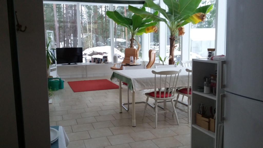 I växthuset är frukosten framdukad i kylskåp och på bordet intill, tillsammans med micro, vatten- och kaffekokare. Där kan du koppla av efter bastun, se på TV eller ut över sjön Varpan.